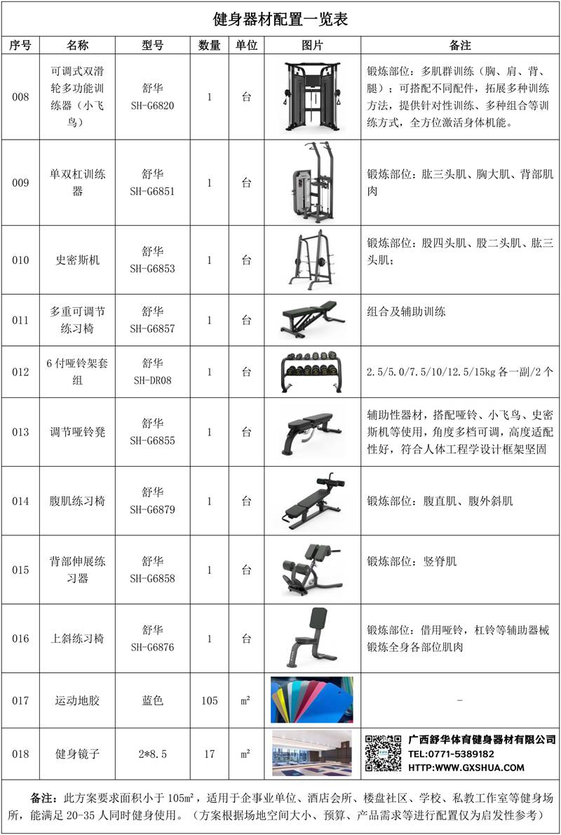 此方案要求面积小于105m²,适用于企事业单位、酒店会所、楼盘社区、学校、私教工作室等健身场所,能满足20-35人同时健身使用。(方案根据场地空间大小、预算、产品需求等进行配置仅为启发性参考)