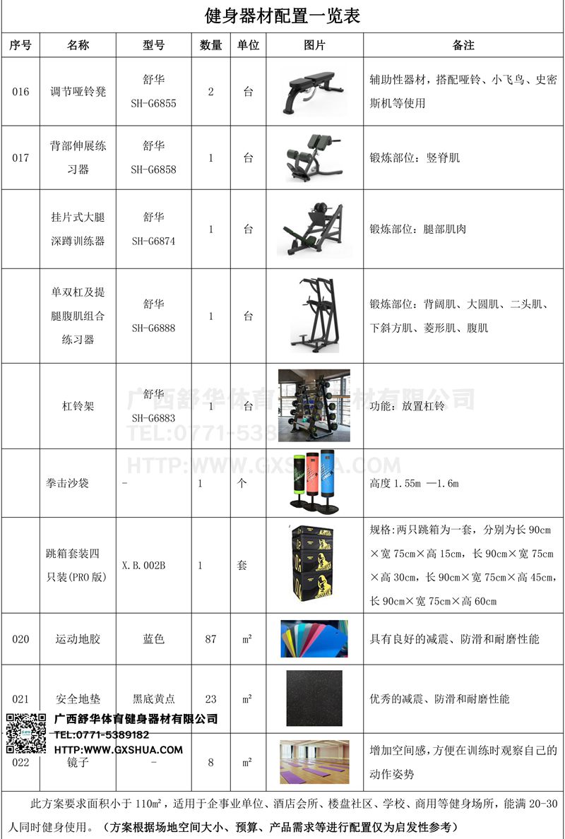此方案要求面积小于110m²,适用于企事业单位、酒店会所、楼盘社区、学校、商用等健身场所,能满20-30人同时健身使用。(方案根据场地空间大小、预算、产品需求等进行配置仅为启发性参考)