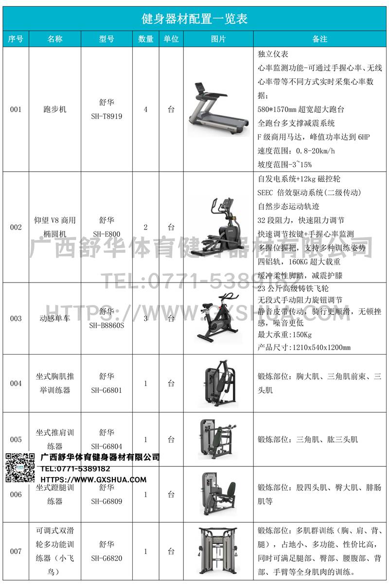 小飞鸟(1台)、史密斯机(1台)、多重可调节练习椅(1台)、罗马椅(1台)、腹肌板(1台)、10付哑铃套组(1套)、哑铃凳(1台),可以实现对不同肌肉群的针对性训练,满足肌肉训练需求,全方位激活身体机能。